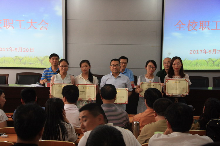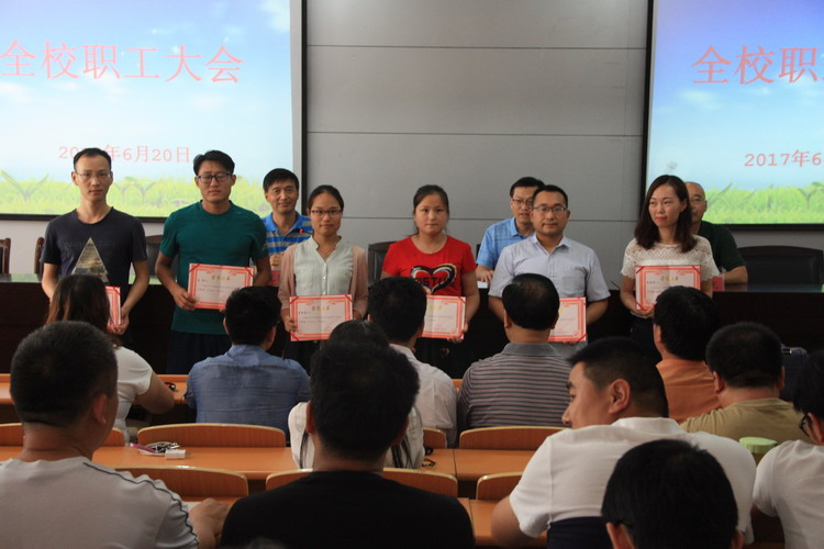 6月20日下午,我校在多功能报告厅召开期末全校职工大会,全体教职工参加。会议由党办主任郭建丽主持。 会上,常务副校长王怀钦宣读我校青蓝工程、优质课评比活动获奖名单,并为获奖教师颁发荣誉证书。 副校长杨建光详细讲解了即将开始的招生工作中需注意的事项,要求大家按照学校规定规范招生,公布了我校招生工作再获省级先进的喜讯,并就此项工作取得的成绩对全体职工表示感谢。 党委书记陈云峰对2017上半年学校及各科室完成的各项工作进行了全面总结,充分肯定了工作中的亮点,指出了工作中存在的问提,对下学期的工作提出了要求,并祝全体教职工愉快度假,平安返校。