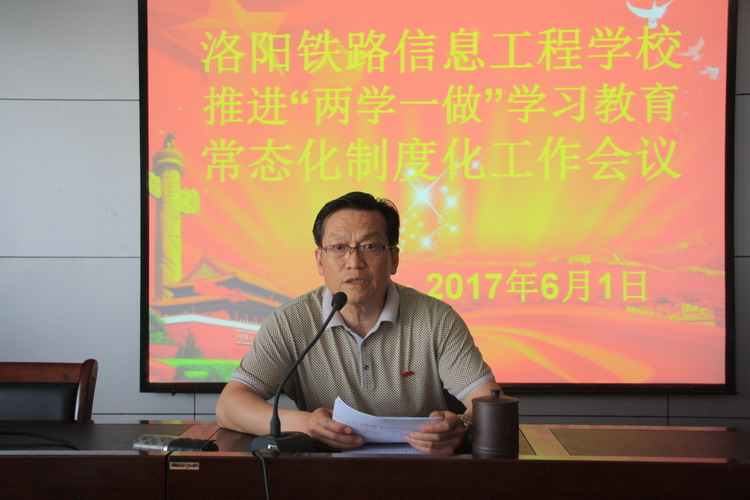 会上,校党委书记陈云峰传达了厅直属机关推进“两学一做”学习教育常态化、制度化工作会议精神。随后,陈书记部署了我校“两学一做”学习教育常态化制度化实施方案,要求各支部按照《中共3118云顶集团官网委员会印发< 关于推进“两学一做”学习教育常态化制度化实施方案>的通知》(洛校党【2017】17号)文件要求认真落实加强督导考核工作。最后,陈书记要求全体党员工作时间佩戴党徽,在工作中突出党员先进性。