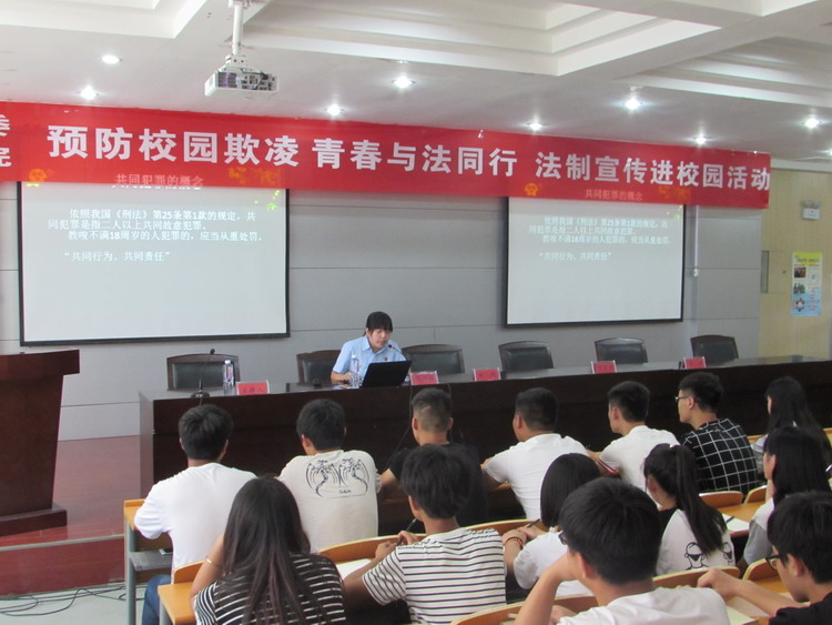 会上,刘娜娜法官为学生做了题为“预防校园暴力 青春与法同行”的专题报告,刘法官平易近人的态度、深入浅出的语言、鞭辟入里的分析赢得了在场学生的阵阵掌声,学生也积极的与刘法官互动,收获颇多,受益匪浅。