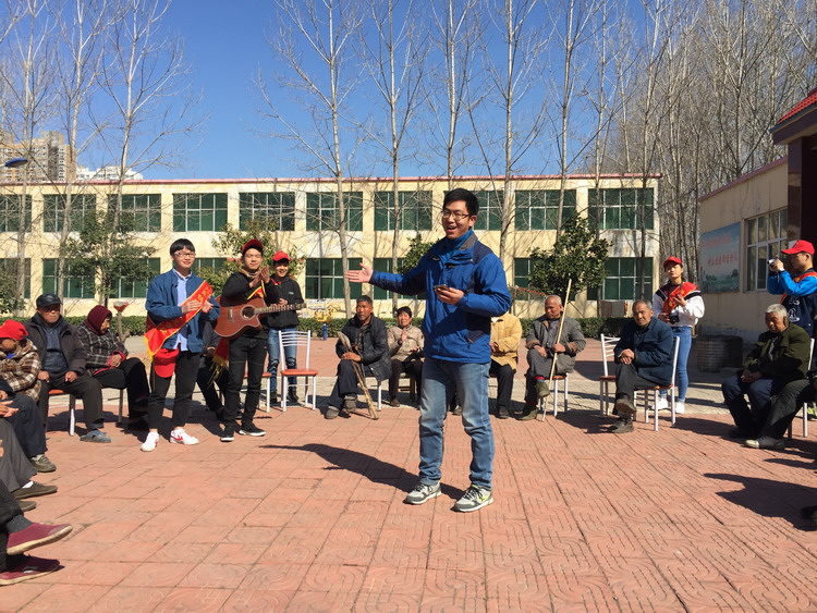 随后,志愿者将老人们小心翼翼地搀扶到小广场上,为他们表演了自己精心准备的节目。吉他弹唱中,一曲《童年》和《打靶归来》展现了不同年代人们的精神风貌和志趣追求,活跃了现场的气氛。组曲《父亲》、《母亲》令在场的老人们不禁动容,相声《我忍不了》和国标舞则让老人们感受到了青年一代的朝气与活力。团委陈志坚老师的一曲美声《我爱你,中国》将全场的氛围推向了高潮。最后,多名老人纷纷加入到演唱队伍中来,激情慷慨的演唱了《没有共产党就没有新中国》、《团结就是力量》等红色歌曲。欢声笑语在小院儿里不停回荡......