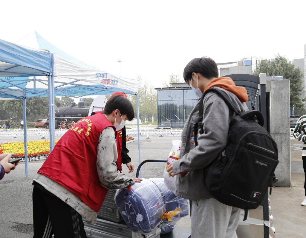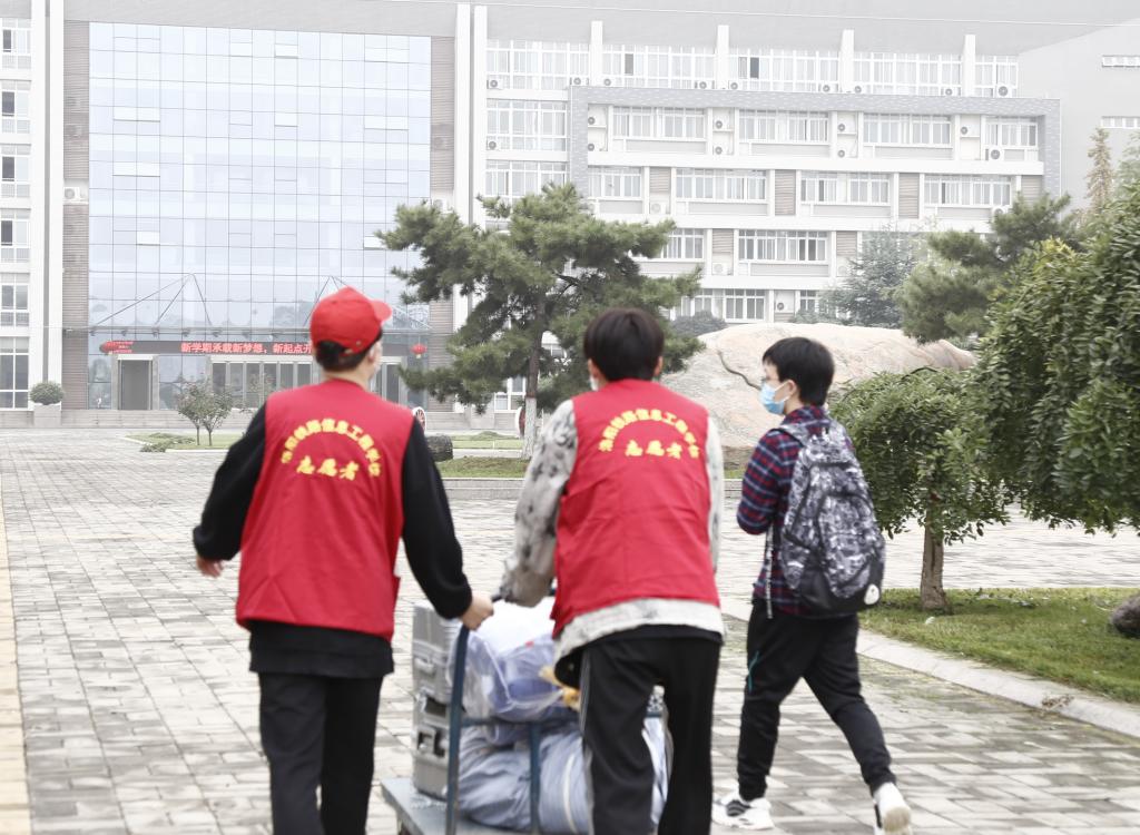 志愿者轮番上阵,接过行李,推起行李运输车,与返校同学一道将行李运至宿舍。报到工作井然有序、方便快捷,每名同学报到入校时间不超过一分钟,极大的减少了人员聚集,降低了疫情防控风险。