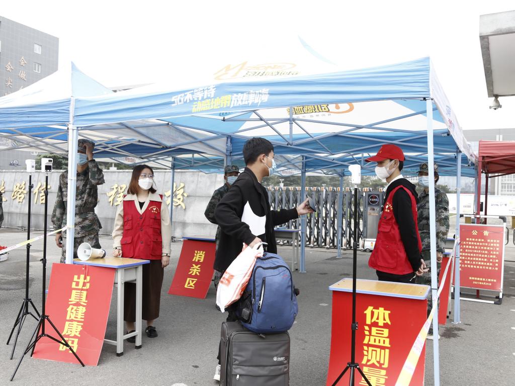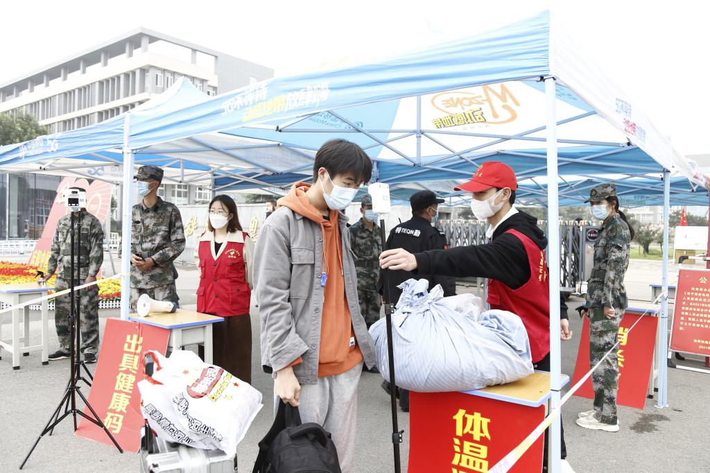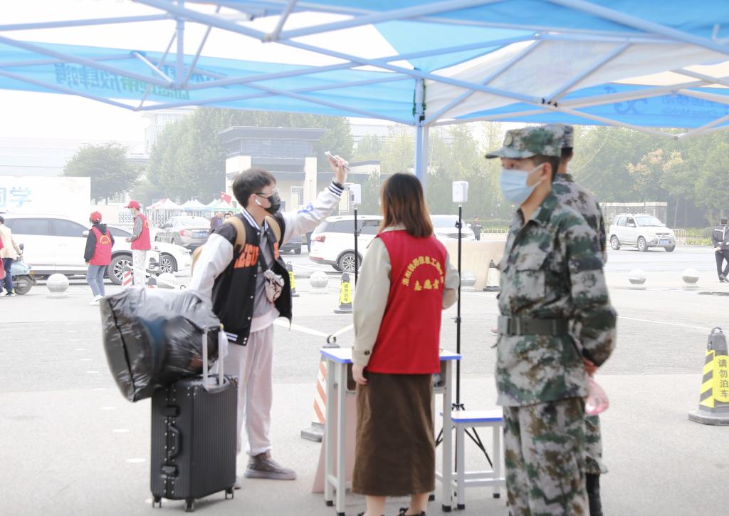 “同学,请出示健康码,测量体温。”学校北门帐篷下,值班工作人员向前来报到的同学们逐一悉心提醒。消杀处,工作人员不放过任何一件行李,不留任何一个死角,仔细认真做好消杀工作。同学们间隔一米,保持安全距离,有序排队入校。
