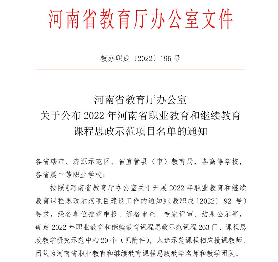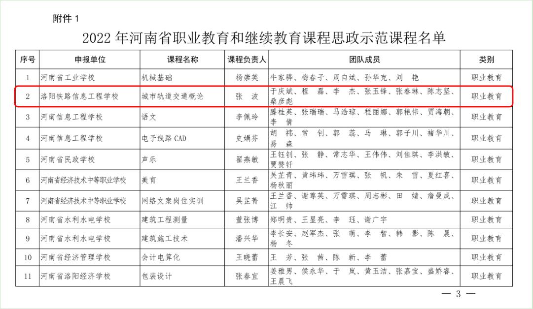 近日,河南省教育厅公布了2022年省级课程思政示范项目名单,我校电信工程系《城市轨道交通概论》课程获批河南省职业教育课程思政示范课程,相应的课程团队获批省级课程思政教学团队。