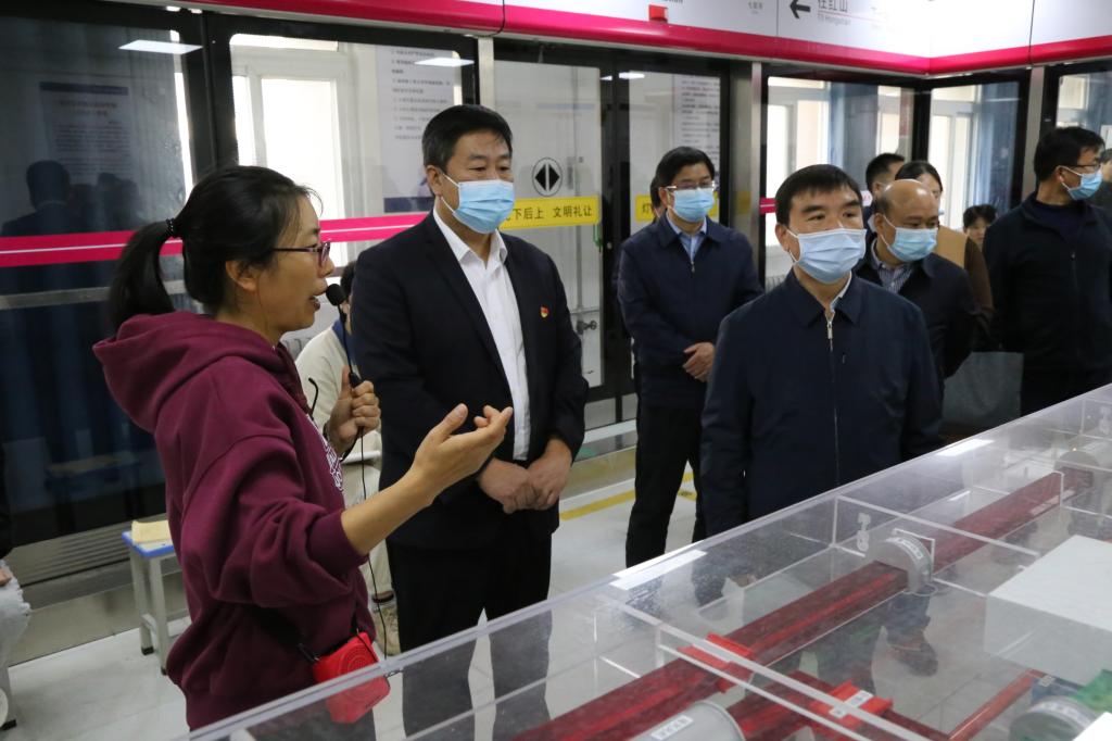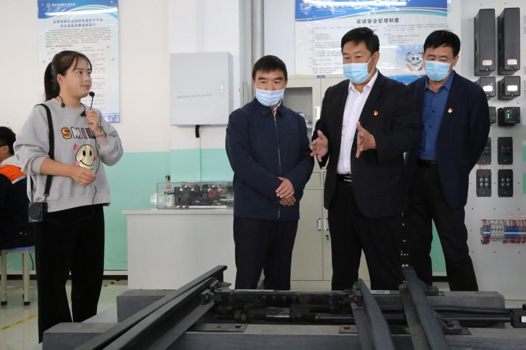 张玉杰一行实地调研了我校信号微机联锁实训室、高铁列控实训室、轨道交通运营综合实训室、光同步传输实训室和高低变电所综合实训基地,并详细了解我校专业设置、办学规模、校企合作、师生竞赛、学生就业等有关情况。