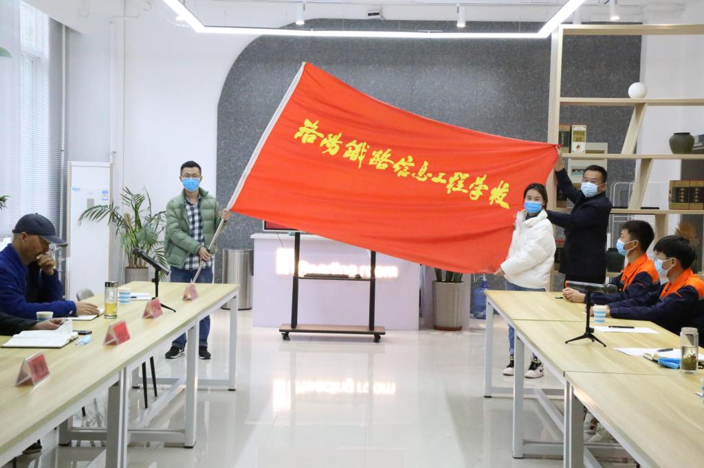 随后,会议举行了出征授旗仪式。校党委副书记、副校长于庆斌代表学校将参赛队旗亲手交到了李杰和王佩硕两位老师手中。