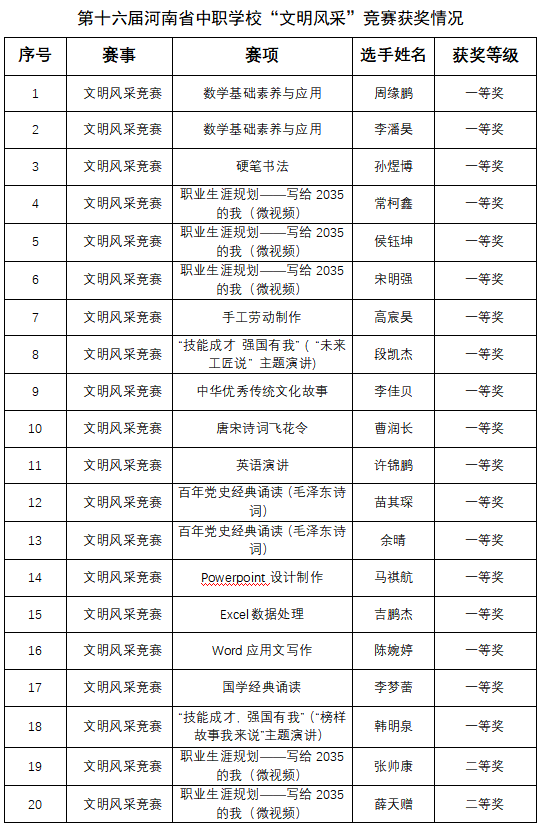 近日,2022年河南省中等职业教育竞赛活动第十六届“文明风采”竞赛各赛项获奖结果陆续公布,我校选派的24支代表队再次以扎实的文化素养和出色的综合能力斩获喜人的成绩,累计获得59个省赛奖项,其中一等奖18个、二等奖18个、三等奖23个,整体比赛成绩较上届相比有了大跨步的提升。