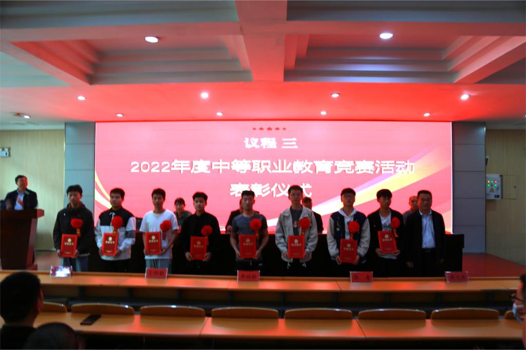 竞赛表彰仪式上,2022年金砖国家职业技能大赛、一带一路暨金砖国家技能发展与技术创新大赛和河南省中等职业教育竞赛等活动获奖师生代表胸前佩戴大红花依次上台,校领导分别为他们颁发了表彰证书并合影留念,现场掌声热烈、经久不息。