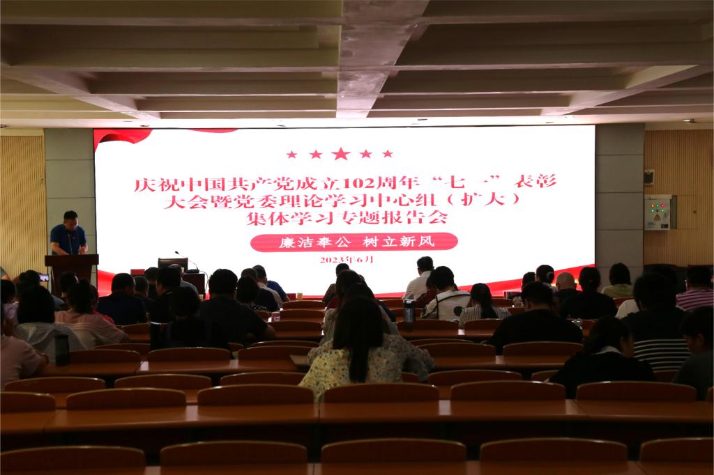 6月20日下午,我校在思政大讲堂召开庆祝中国共产党成立102周年“七一”表彰大会暨党委理论学习中心组(扩大)集体学习专题报告会。邀请到了河南科技大学张俊国教授作主题教育专题报告。学校领导班子、党委委员、全体党员参加会议,会议由党委副书记、副校长于庆斌主持。