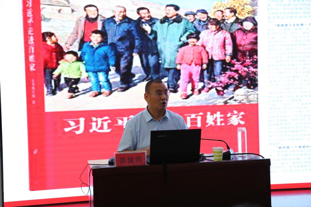 张俊国教授围绕主题教育“廉洁奉公、树立新风”主题,以修身齐家、廉洁奉公——深入学习习近平总书记关于家庭家教家风的重要论述为题,为全体党员讲授一场精彩纷呈的报告。他重点讲授了习近平总书记关于家风的论述,指出家风是个人全面发展的重要根基,是家庭文明建设的重要推动力,是社会风气的重要组成部分。分别从个人、家庭、国家三个层面,讲授了家风的基本内涵,并讲解了这一理论带给我们的现实启示。