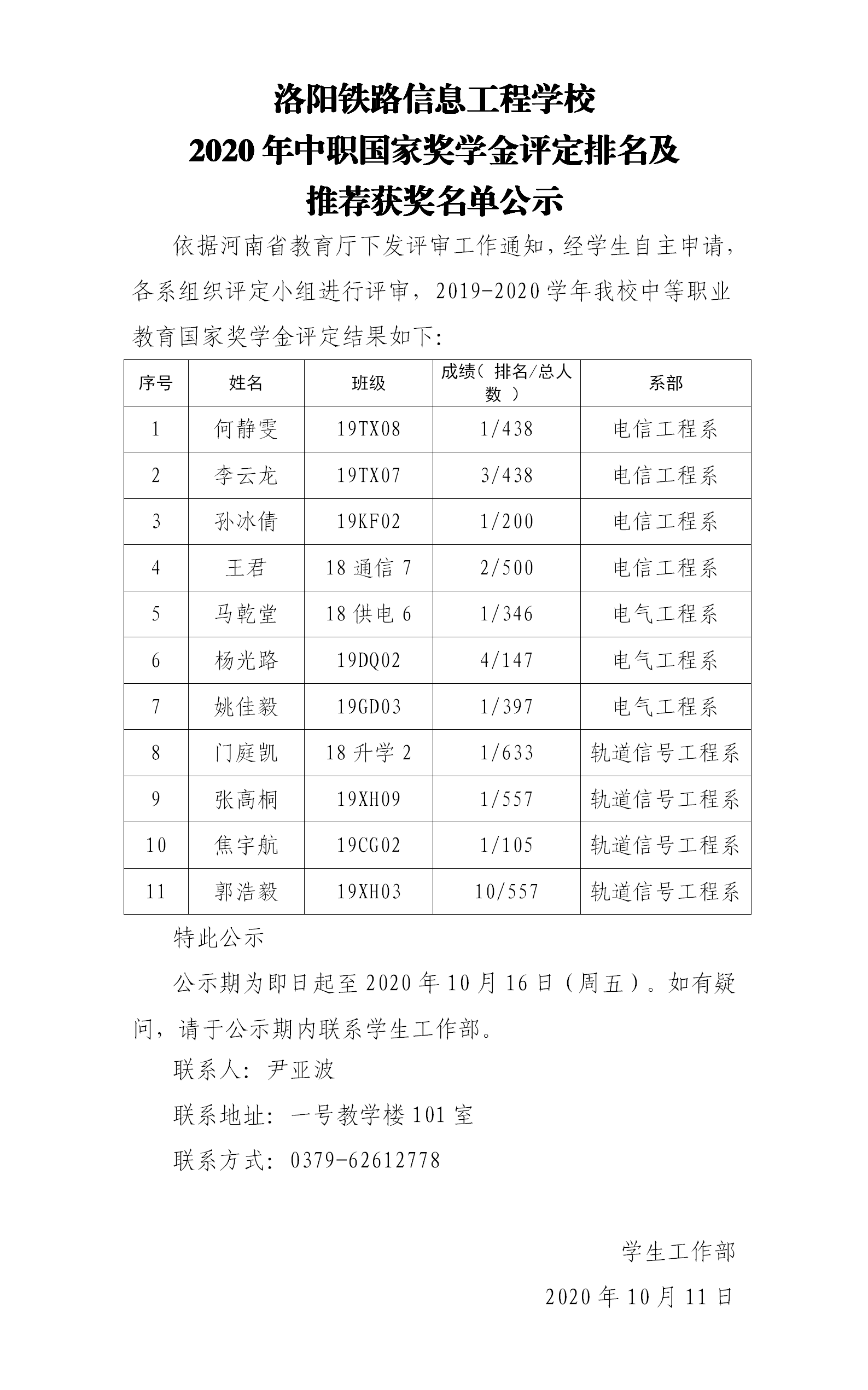 3118云顶集团官网2020年中职国家奖学金评定排名及推荐获奖名单公示