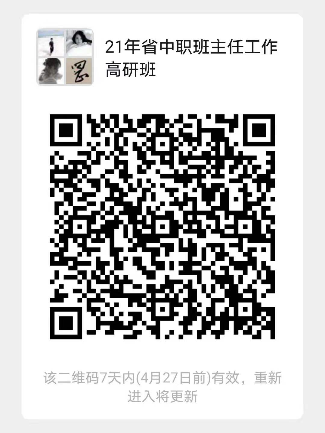 为方便沟通联络,现建立2021年河南省中职学校班主任工作高级研修班微信群,请各位学员及时扫二维码入群。进群后,请及时将您的备注改为“姓名+单位”,感谢您的配合。我们将及时发布相关信息,竭诚为您服务!