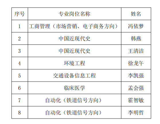 根据各专业应聘人员的总成绩及排名,按照体检人员与招聘岗位数1:1的原则,结合学校专业岗位招聘计划调整情况,确定参加我校统一组织的体检人员8名: