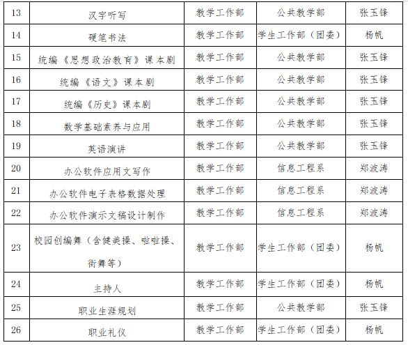 成 员:教学工作部、党政办公室、学生工作部、各教学系部(校区)及团委主要负责人,各系教学干事、各教研室主任、各赛事辅导教师团队。