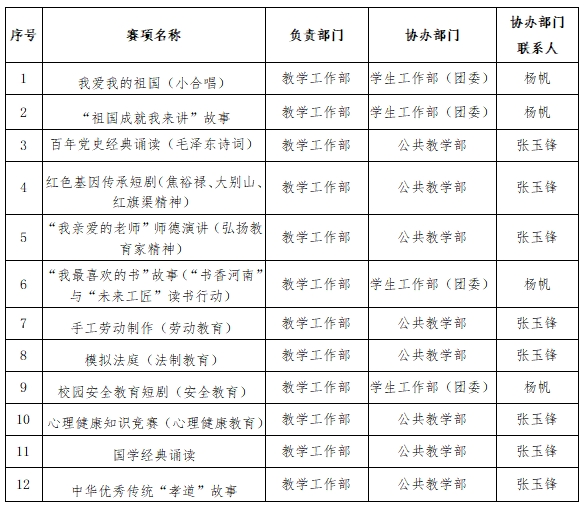 (五)各项赛事均面向全校师生(含各分校区)开展,赛事的宣传、选拔、培训、管理、比赛、总结等日常工作由各协办部门负责。各协办部门应及时向全校师生(含各分校区)公布各赛项的选拔方案,支持和鼓励全校师生共同参与,全过程坚持以公开、公正、择优的原则开展选拔工作。