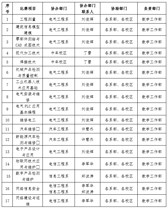 本次技能大赛校内选拔赛由教学工作部负责,各系部、校区协办,其他相关部门协助,有意参赛的教师可以向协办部门报名参加遴选,具体安排如下: