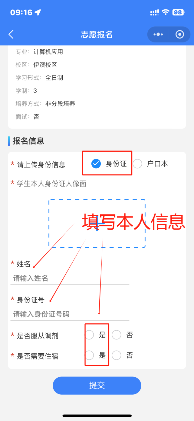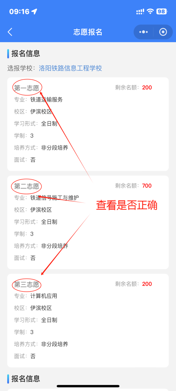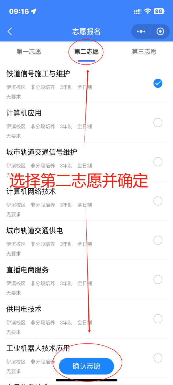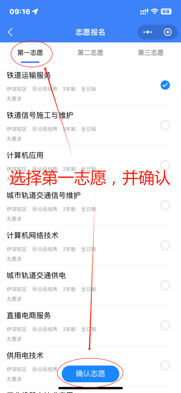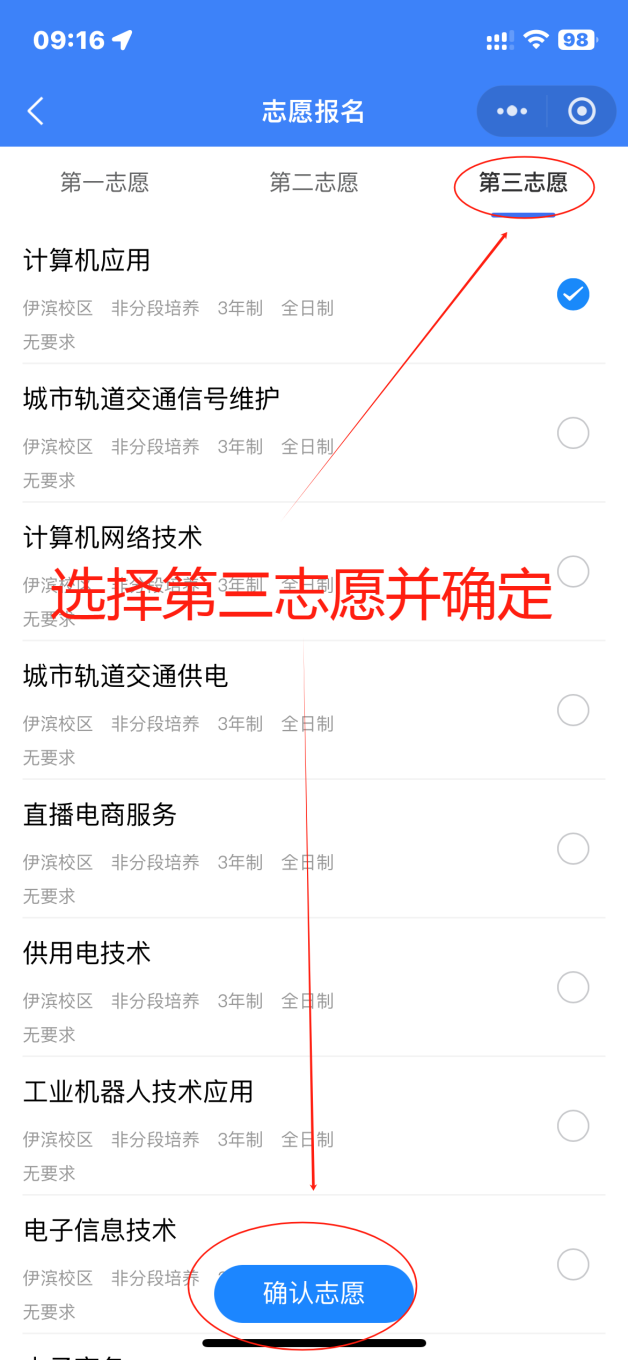 注意:填报时必须要报三个志愿,我校以第一志愿为录取专业,并且第一志愿需与我校报名小程序中已录取专业保持一致。
