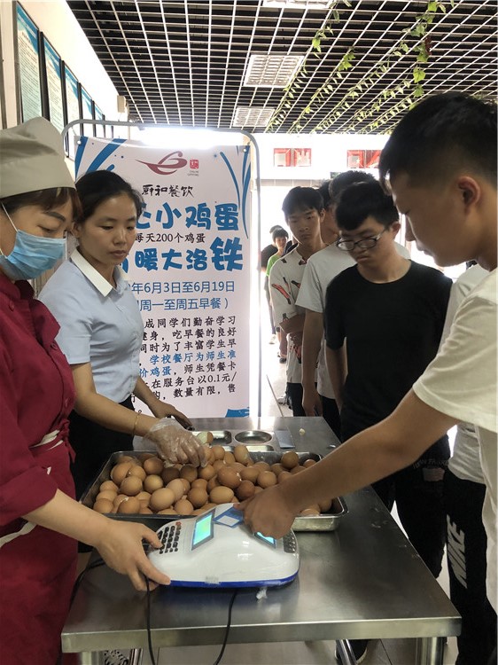 为引导全校师生自觉养成早睡早起的学习、生活习惯,提高师生早餐营养。总务科与洛阳师范学院餐饮中心联合开展了“爱心小鸡蛋,情暖大洛铁”早餐送鸡蛋活动。