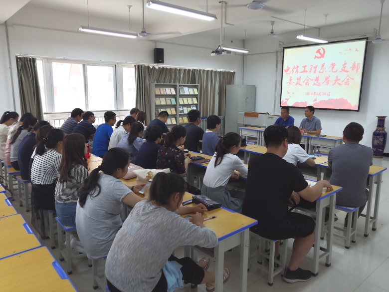 5月28日下午,电信工程系党支部在2号教学楼231教室召开了委员会选举大会。校党委委员于庆斌和全体党员参会,电信工程系主任张波作为临时召集人主持会议。