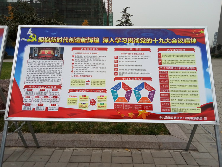 为了贯彻落实党的十九大精神,帮助全体师生在全面系统学习领会的基础上,抓住重点、抓住关键、抓住精髓、抓住要义,准确领会和把握十九大提出的新理念、新论断、新任务、新举措,校党委精心布置了一系列学习十九大精神重点和要义的宣传版面,如“十九大关键词”系列活动版面、“掌握新思想,开拓新实践”系列橱窗版面,还有对十九大精神进行高度总结的“拥抱新时代,创造新辉煌”的活动版面。