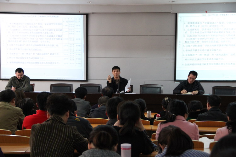 王校长回顾总结了上学期工作,对全体教师的辛勤付出和取得的优异成绩表示衷心的感谢和祝贺。他从“一师一课”活动,教学资源库建设,教师队伍建设,强化管理四个方面对新学期的工作提出了具体要求,鼓励大家以崭新的精神风貌扎实做好2017年度工作。
