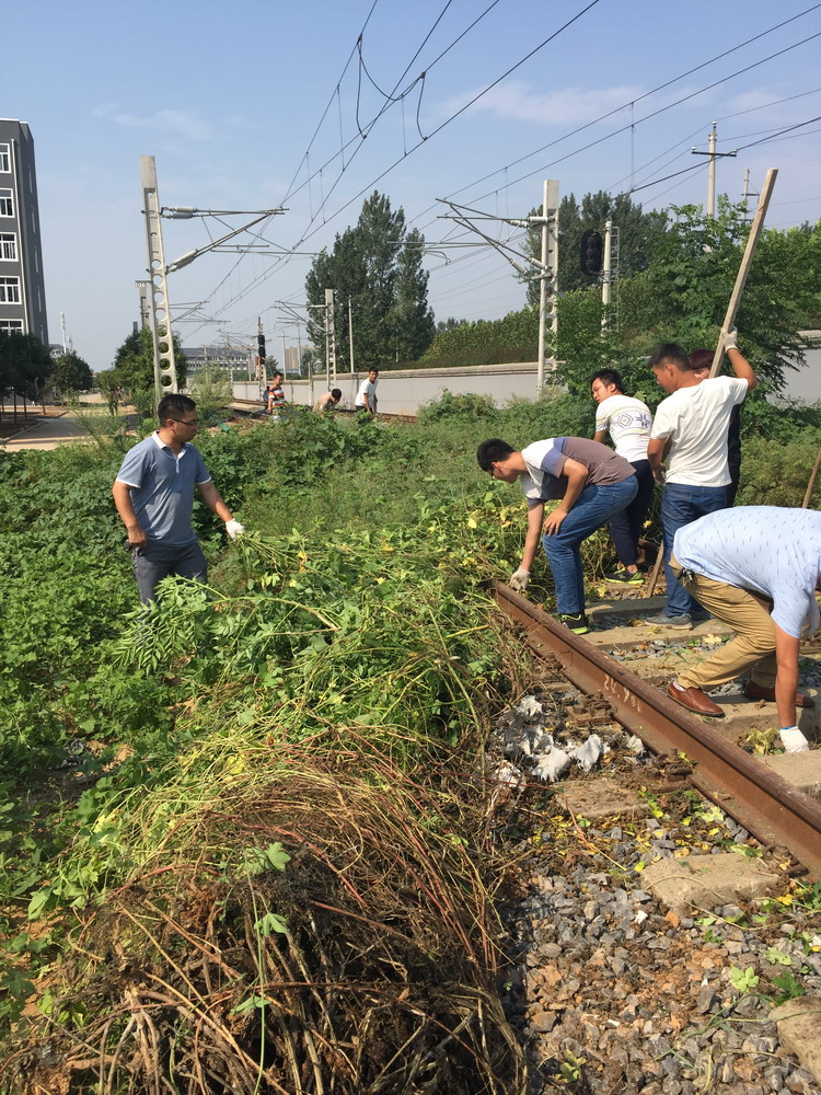 8月30日,为了营造良好的实验实训环境,二号实训楼组织青年教师和部分学生同学对综合演练场进行清扫整理。 放假期间,站场南段股道内杂草丛生,已将3个股道及其地面上的信号箱盒和电缆设备全部覆盖,影响了教学工作的展开。二号实训楼青年教师带领1522班的同学们,利用课余时间对杂草进行了清理,大家不怕脏不怕累,顶着烈日,最终完成了3个股道的清理任务。下一步将继续组织人员对演练场其他部分进行清理整顿,保障教学工作的顺利进行。