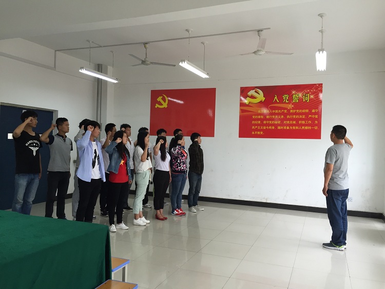 5月26日上午,校党委批准刘朵朵等14名同学为中共预备党员后,学生党支部在业余党校召开了入党宣誓大会。10时许,伴随着铿锵有力的《国际歌》,组织委员寇斌同志带领14名预备党员,面对鲜艳的党旗进行了庄严宣誓。预备党员代表赵帅进行发言,他表示以后会更加努力的学习和工作,积极主动地担负起党赋予的责任,为学校争光,为党旗添彩。