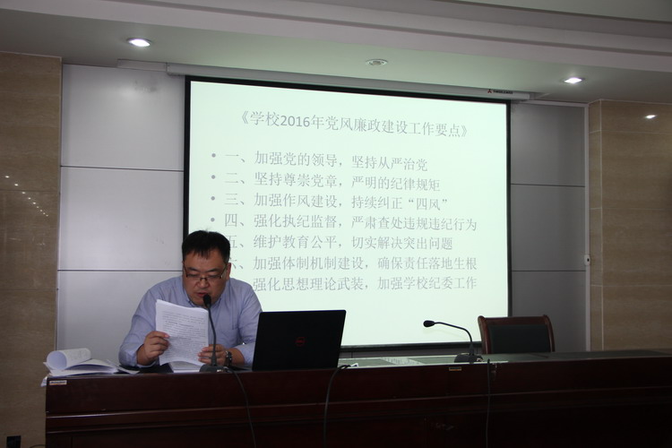 尹书记首先向全体党员传达了《学校2016年党委工作要点》和《学校2016年党风廉政建设工作要点》文件精神,对两份文件的内容作了详尽解读;随后结合两份文件,布置了本学期支部的主要工作:一是要结合学校党委总体工作部署,结合支部工作实际,认真组织,注重实效,积极开展学习工作;二是扎实做好党建工作,过好组织生活,按照相关要求做好党员发展工作;三是用好活动经费,夯实支部建设基础,多样式开展党员活动;四是做好本学期教务支部工作的宣传报道,要及时反映工作风采,发挥宣传工作鼓舞人,弘扬正能量的作用。最后尹书记要求全体党员增强党性观念和党员意识,在日常生活工作中时刻牢记党员身份,争做合格党员。