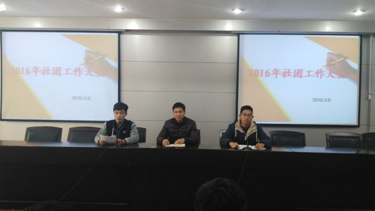 3月8日校团委组织我校全体社联成员在1号实训楼2楼多功能报告厅召开2016年度社团工作大会,校团委书记张波和团委老师陈志坚出席会议。