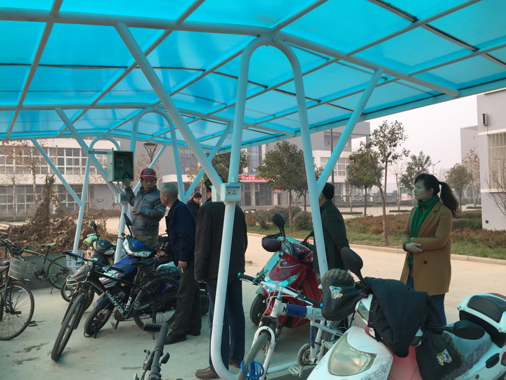 2015年12月9日上午,我校对电动车停车棚进行验收。总务科副科长王罡、电工尹亚东,施工单位项目经理李振宪,新建办主任王树军、副主任邱智铖、现场工程师滕建义、马琳珊、杨凯丽、王欢组成验收小组参加本次验收。