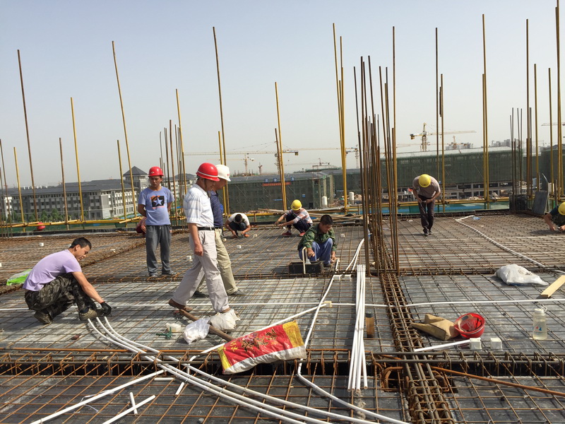 近日,我校新校区2#教学楼工程相继完成一到五层梁、板、柱、梯放线,模板绑扎,混凝土浇筑,拆模等工序,已按进度计划封顶,主体工程顺利完成。 新建办全体人员以及监理单位工作人员每天到施工现场进行现场监督,发现问题及时处理,严格把控质量关。在浇筑上层混凝土时,为克服下层浇筑的不足,三方及时召开讨论会议,提出解决方案,技术上要求精益求精。为克服阵雨冰雹等不利天气因素,大家共同协商安排进度计划,以确保2#教学楼能够按期竣工。
