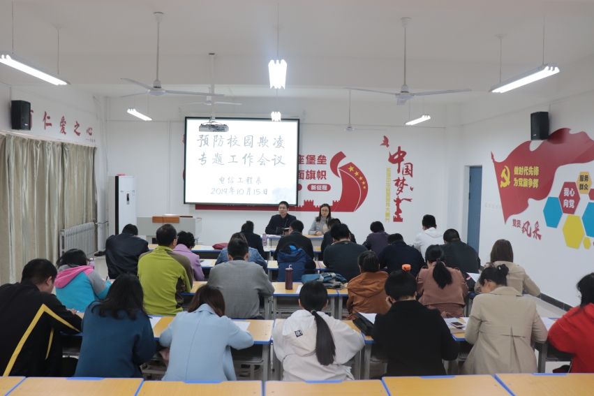 10月15日下午,电信工程系在二号教学楼会议室召开了预防校园欺凌专题会议。电信工程系主任张波、副主任李琼和全体班主任参加了会议。
