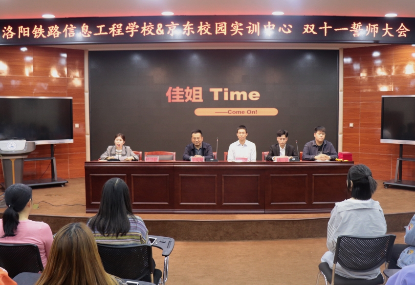 10月23日下午,我校京东校园实训中心在智慧教室举行了学员表彰暨双十一誓师大会。副校长于庆斌、电信工程系主任张波、京东校园实训中心负责人杨佳佳、京东校园运营金牌讲师胡超及电子商务教研室全体专业教师出席,京东班和18客服班参加了本次大会。
