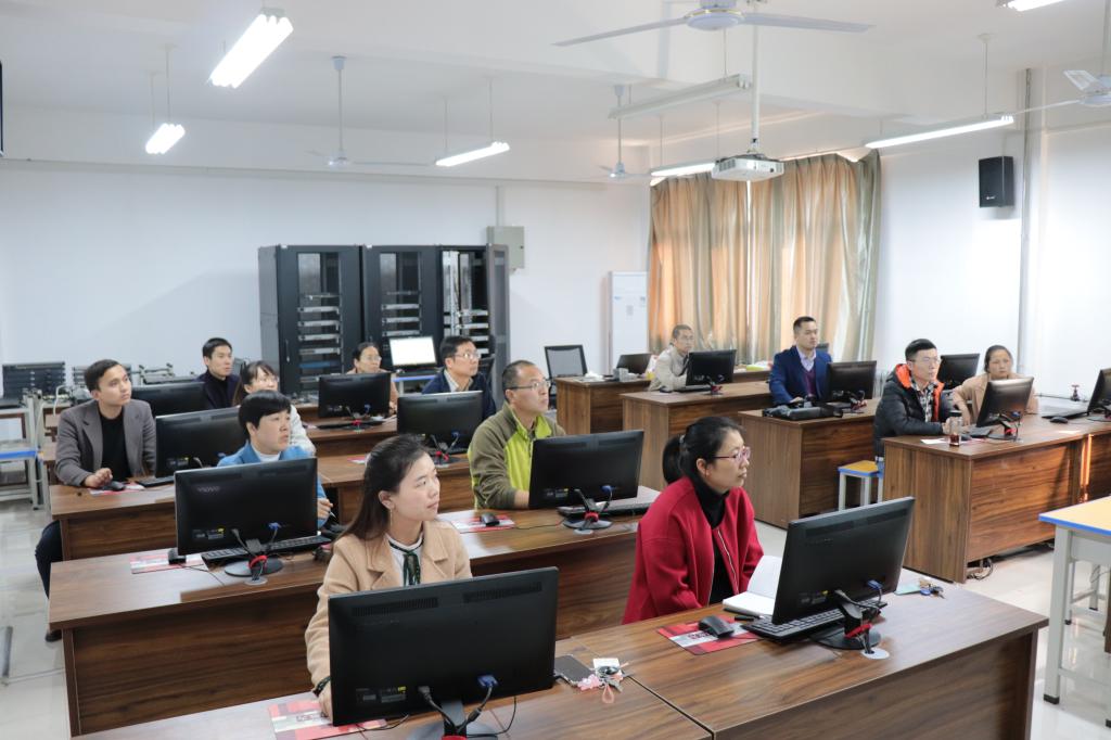 随后,我校电信工程系与南京柯姆威公司在2号教学楼323教室召开了专业建设和实训室建设研讨会。南京柯姆威公司副总经理彭永龙向大家介绍了铁路通信全网仿真实验系统,并开通账号组织与会教师进行体验。