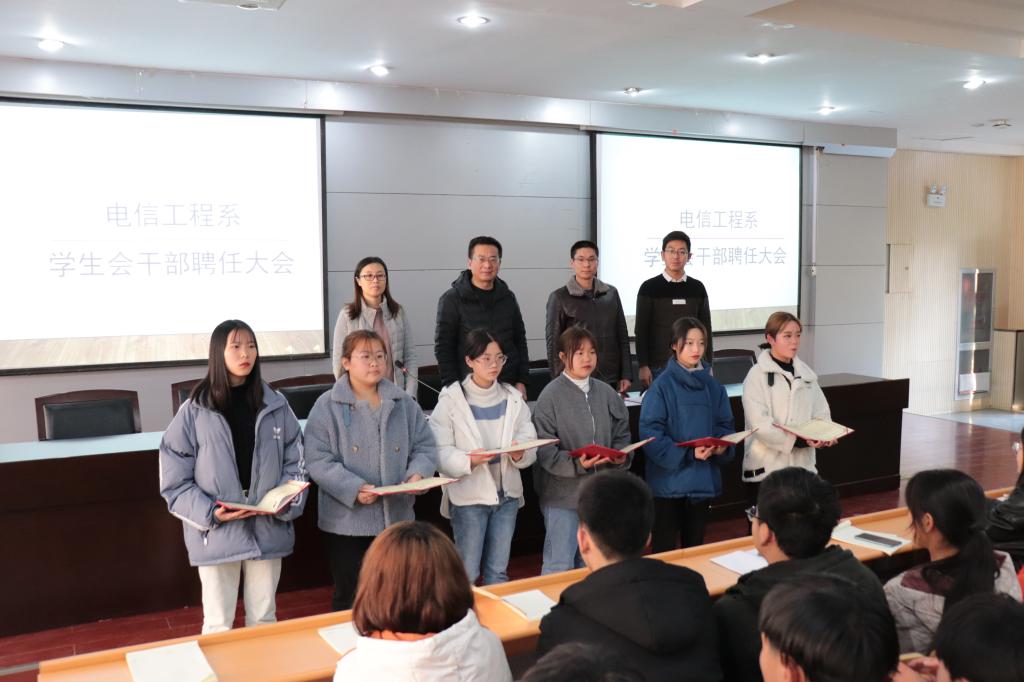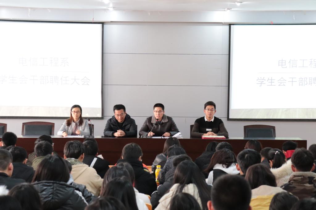 12月2日下午,电信工程系在报告厅召开学生干部聘任大会。副校长于庆斌、系主任张波、系副主任李琼、团总支书记陈志坚出席大会,会议由李琼主持。