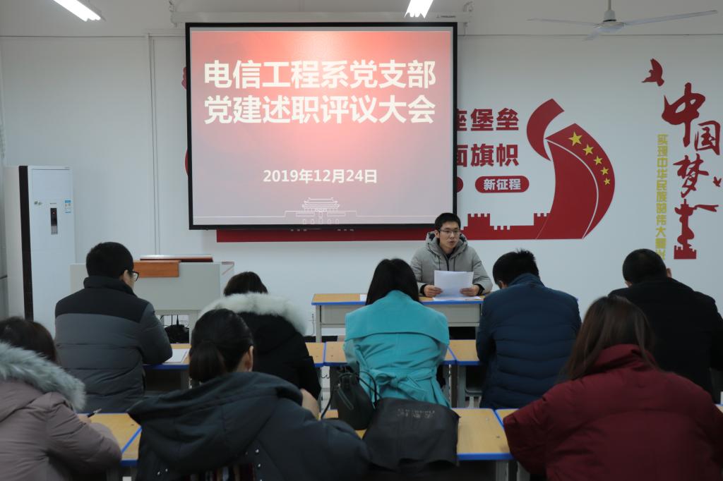 12月24日下午,电信工程系党支部在2号教学楼党员活动室召开了党建述职评议暨学习十九届四中全会精神大会,会议由党支部书记张波主持。