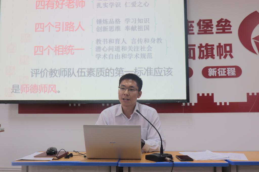 随后,张波同志为大家上了“立德修身铸师魂,做好学生引路人”的主题党课,他从习近平总书记关于师德师风的重要论述、什么是师德师风、为什么要立德修身、怎样立德修身四个方面做了详细、系统的介绍和解读。
