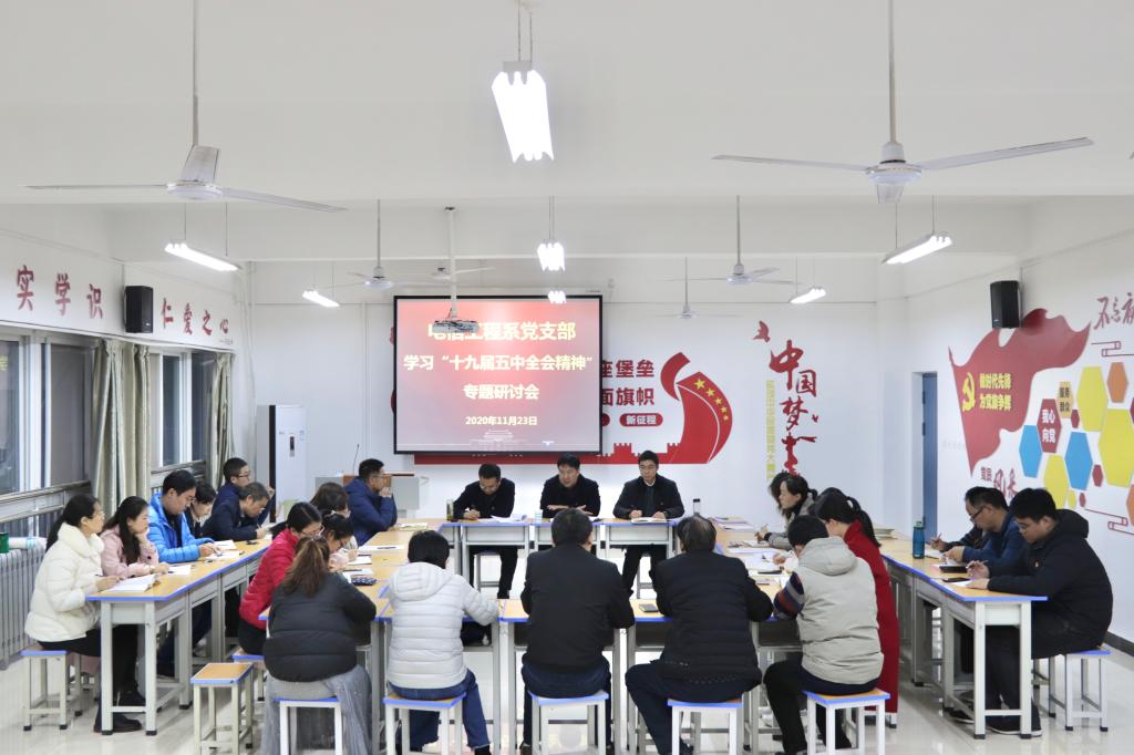 11月23日下午,电信工程系党支部在党员活动室召开了学习十九届五中全会精神专题研讨会,校党委书记李林榕、副校长于庆斌参加了本次会议,会议由系党支部书记张波主持。
