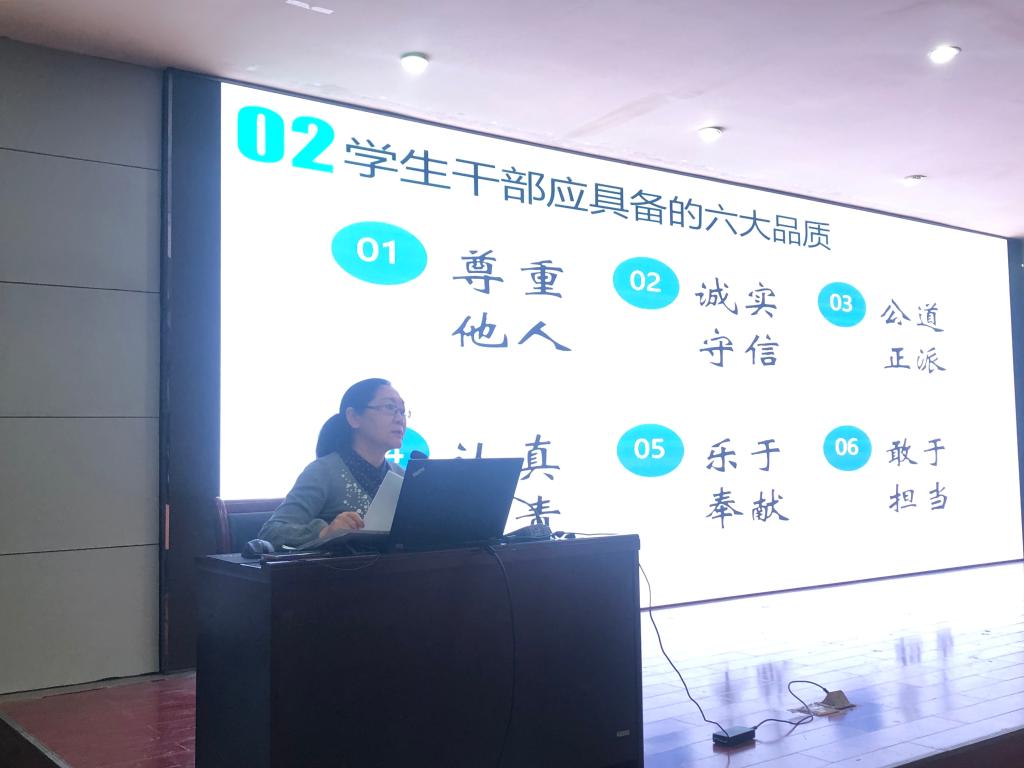 孙迎霞就学生干部在工作中存在的问题展开讲述。从学生干部应具备的六大品质、六大能力以及如何做好学生干部工作入手,指出成绩优秀、严于律己、乐于助人是选拔学生干部的前提。强调学生干部首先要身正、行正、办事公道才能更好地服务于学生管理工作。