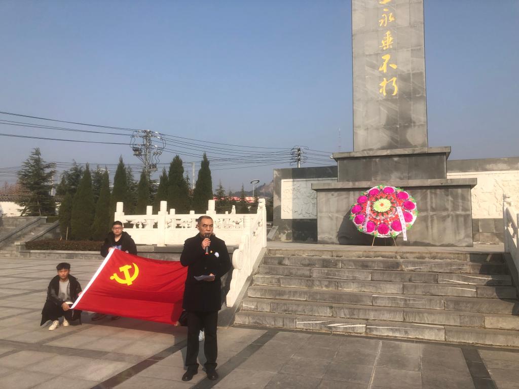 烈士纪念碑前,支部党员面向党旗重温入党誓词,入团积极分子面向团旗庄严宣誓,团员代表向烈士纪念碑敬献花圈。