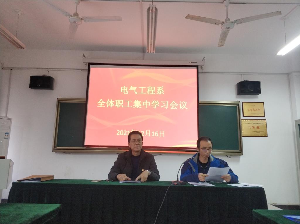 12月16日下午,电气工程系在1号教学楼338活动室召开集中学习会议,电气工程系全体职工参加,会议由党支部副书记杜盟盟主持。