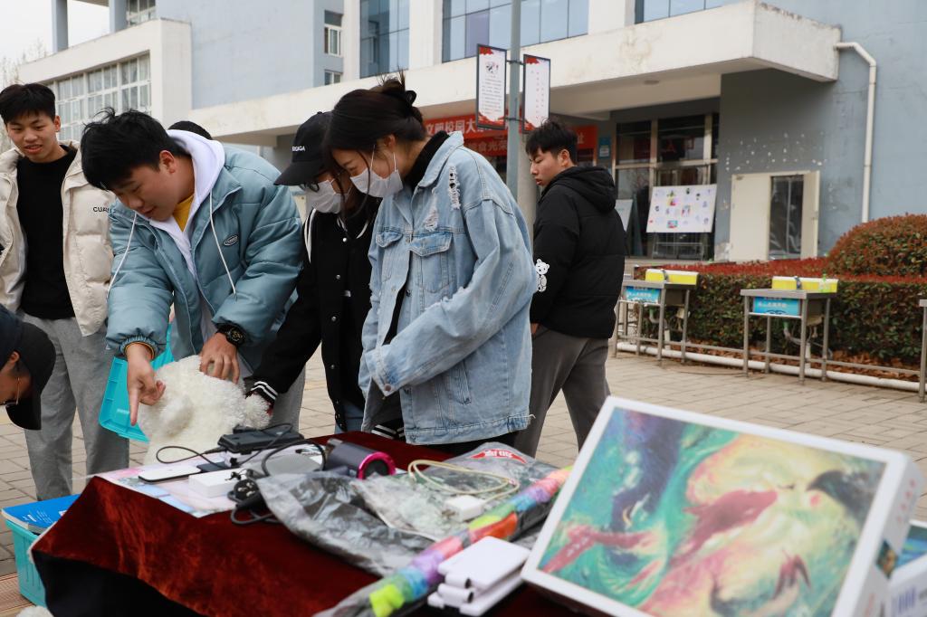 现场热闹非凡,叫卖声不绝于耳,同学们将自己的闲置物品拿出来交换,实训工具、运动器材、书本等生活学习用品引来同学们驻足购买。