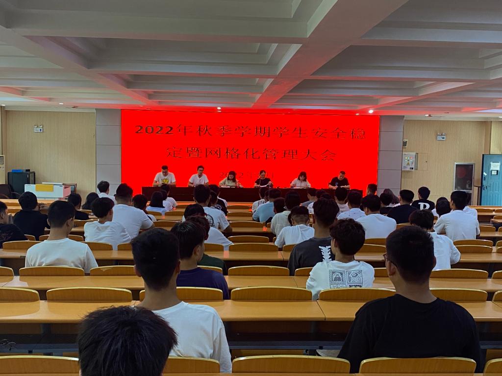 8月24日下午,我校在一号实训楼思政大讲堂召开2022年秋季学期学生安全稳定暨网格化管理大会,学工部副部长张静、四系学管主任、军事思政总教官、学管老师、各班级班长以及相关学生干部参加此次会议。会议由张静主持。