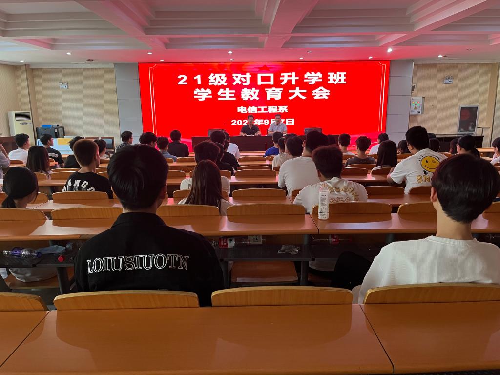 近日,电信工程系在思政大讲堂召开了2021级对口升学班学生教育大会,电信工程系党支部书记、系主任张波,副主任陈志坚及200余名对口升学班学生参加了会议,会议由系办公室老师文茹主持。
