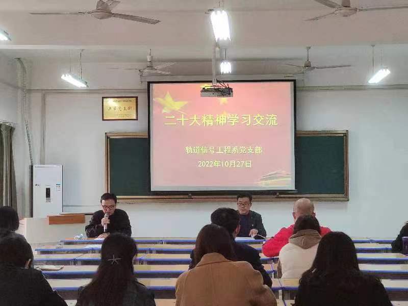 10月27日下午,轨道信号工程系党支部在1号教学楼238召开党的二十大精神学习交流会,全体党员参加,会议由党支部书记张建平主持。