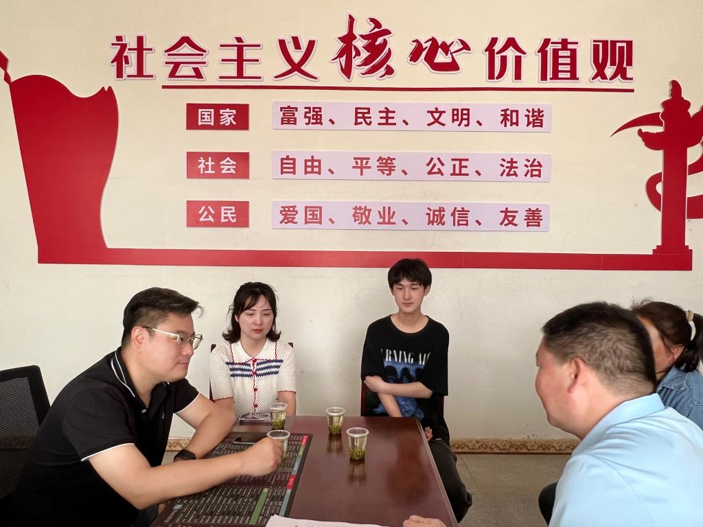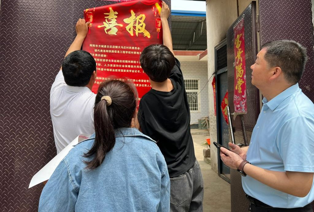 邱智铖将喜报及荣誉证书送到家长手中,并与村两委领导和学生家长进行了亲切交流,了解了学生在家乡的成长背景及生活经历,同时也向他们介绍了学校的历史背景、办学规模、专业设置、就业前景等情况。邱智铖表示,优秀的学生离不开个人、家庭、学校三方的共同努力,希望家校保持良性互动,继续提高教育实效,促使学生幸福成长,自信地走向人生下一阶段。