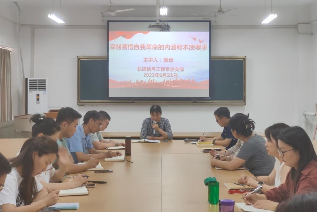 根据校党委开展主题教育的整体安排,6月21日上午,校党委委员、纪委书记郭青以《深刻领悟自我革命的内涵和本质要求》为题,为轨道信号工程系党支部全体党员讲授专题党课。