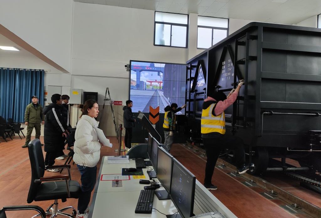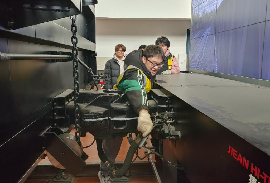在工作人员的带领下,师生参观了职工培训基地。工作人员重点演示了铁路调车作业实训平台,该平台是面向区域调车长、调车长、连结员等相关岗位的职工培训。师生共同体验了相关岗位工作,工作人员耐心指导操作要领,并向大家介绍了新技术和新设备。