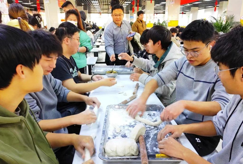 活动中,师生齐上阵,有的准备饺子馅儿,有的擀饺子皮儿,有的包饺子,分工合作,锅碗瓢盆碰撞声中,同学们欢声笑语中,一个个形态不一的开心饺子呈现在餐盘之中。活动现场气氛和谐、笑语不断,到处洋溢着“家”的味道、“家”的温馨。热乎乎的饺子,拉进了师生间的距离,温暖了这个冬天,使同学们切身感受到洛铁大家庭的幸福与温暖。