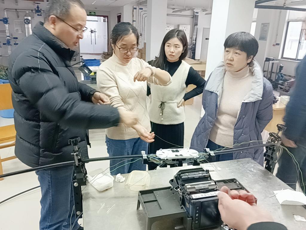 苏州光电缆工艺研究所是中国铁路通信信号上海工程局集团有限公司在苏州的分支企业,是铁路唯一的集科研、生产、培训为一体的光电缆施工工艺专业研究单位。在这里,“全国技术能手”黄健老师进行了馈线和漏缆接头制作及连接头防水处理工艺、天馈系统及漏缆驻波比测试;光纤熔接、光纤盘留、光缆接头盒组装和光缆测试、光缆线路故障判断及维护;2M同轴缆线绑扎及成端、RJ45网络缆线和音频配线电缆捆扎及成端等内容的展示。通过黄健娴熟的操作和讲解,参加培训的老师对整个过程有了更全面的认识和更深刻的理解,并虚心请教讨论,解开教学疑惑;观摩后,老师们积极主动练习,力争达到更好的学习效果。