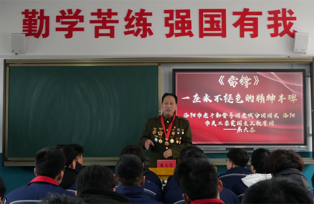 秦大志为全体学生讲述雷锋故事。雷锋精神就是要助人为乐,要默默无闻,要勤俭节约,要无私奉献,要热情似火,更要有爱国精神,鼓励学生们努力学习,勤学苦练,学好专业技能,报效祖国。